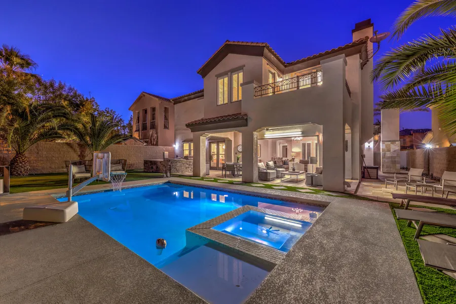 Experience the epitome of luxury living at 4135 Villa Rafael, nestled within the guard-gated community of Tuscan Cliffs in desirable Southern Highlands master planned community. This 6-bed, 4.5-bath, 5,838 sq ft semi-custom mansion boasts opulence at every turn, featuring a captivating stone exterior, a glass- enclosed wine storage room, and a sprawling rear pool. Step in through the private courtyard to discover an attached casita, a grand chandelier, and a curved staircase in the entryway. The chef's kitchen delights with a spacious fridge, double oven, and an inviting island for quick dining. The primary bedroom wows with a sitting area, private balcony with stunning mountain views, and an extravagant super shower and separate tub setup. Even the closets exude luxury. Outdoors, enjoy well-designed courtyards, a barbecue, fireplace, and a pool/spa combo with a basketball hoop. The expa...