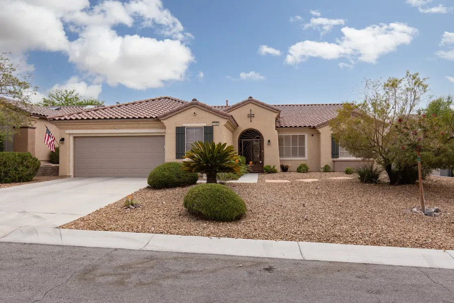 Beautiful, meticulously maintained home nestled within the highly sought after 55+ community of Sun City Anthem! Extensive upgrades - gorgeous wood look vinyl flooring, shutters & custom designed security door. Solar panels help keep energy costs low! This 2 BR open floor plan with a den/office blends style, comfort & functionality. As you enter, you're greeted by a spacious & inviting great room w/a cozy gas fireplace. Large eat-in kitchen boasts beautiful marble counters, island w/breakfast bar seating, newer S/S appliances & pull out shelves. Spectacular mountain views from your private back yard oasis which includes a huge screened in patio w/pebble stone flooring, a separate covered patio, fig tree & no neighbors behind! Both the master bedroom & bath have been tastefully remodeled - marble counters, dual sinks, custom tile walk-in shower & walk-in closet. Separate 2nd BR is perfect...