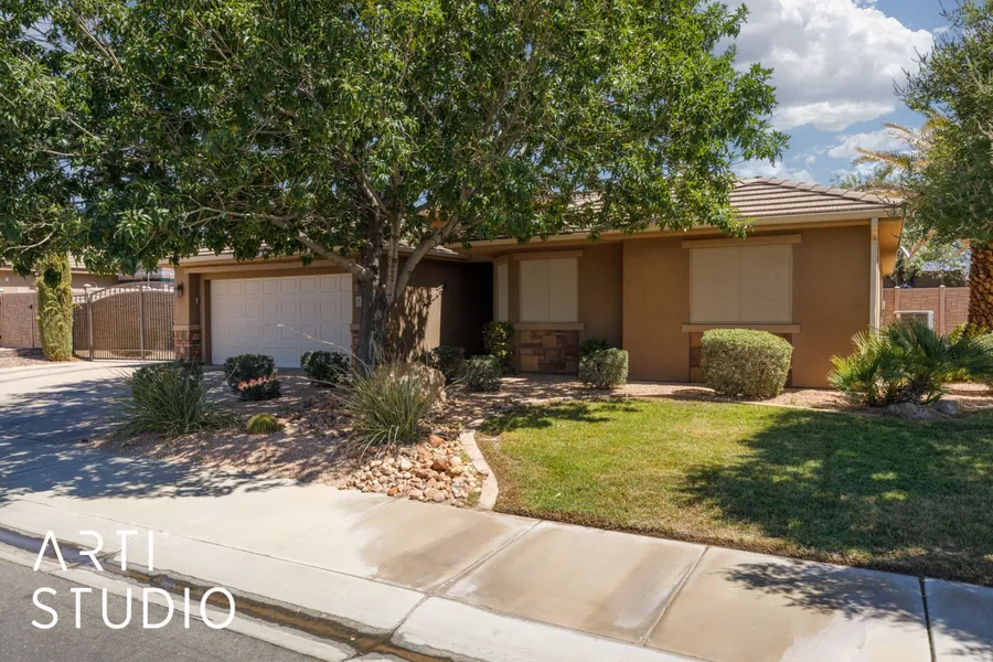 Come see all that this 4 bedroom home has to offer, starting with a desirable floor plan that includes all the spaces one would need including ample storage. The concrete RV parking has power, water, and sewer hookups all situated behind a beautiful metal gate. This corner lot property has a lush backyard with an extended concrete patio, garden space, and mature trees. Enjoy the large tub in the main bathroom in addition to the walk in shower, and duel walk in closets. Located next to Mesquite's trail system, you're not far from a beautiful morning walk next to the Virgin River. Owner Agent.