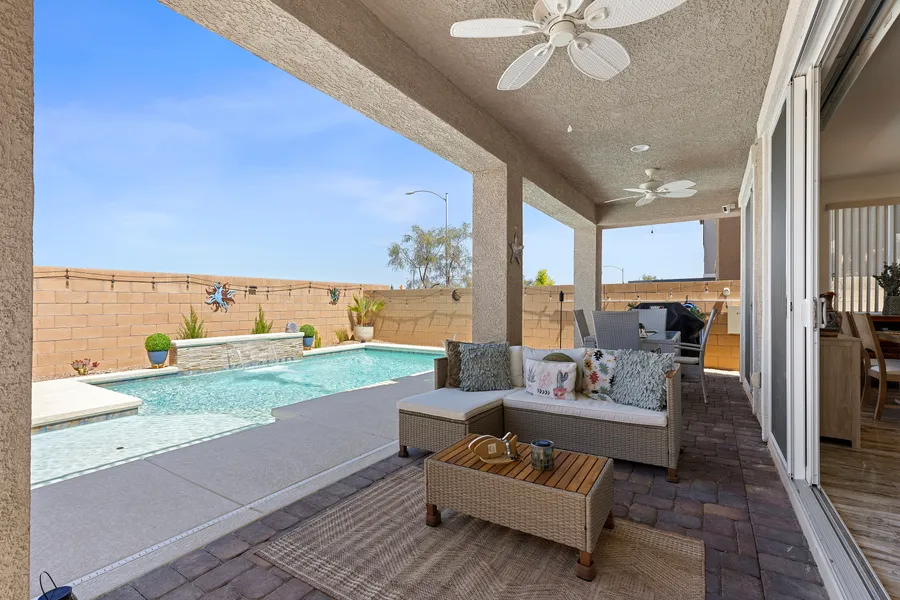 Built in 2021, this stunning 3 bedroom home with a loft, which could be converted into a 4th bedroom, offers modern comfort and exceptional design. Spanning 1,900 sq. ft, with open concept living space features a gas fireplace, a seamless indoor-outdoor flow with 2 sets of sliding glass doors leading to the covered patio. A heated pool completes the backyard oasis. The primary suite boasts a private balcony with breathtaking mountain views. Additional highlights include two full bathrooms, a downstairs powder room, a Ring doorbell with three wired security cameras, and a water softener. Garage has epoxy flooring and large walk in storage closet. Conveniently located near dining, shopping, and scenic hiking trails, this home is an exceptional find. Welcome Home.