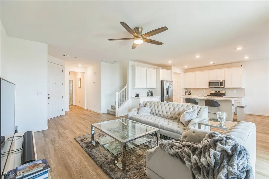 Experience elevated living in this upgraded Lennar Declan model with over $23K in design center enhancements. Take in breathtaking Strip and Mount Charleston views from your private deck. Interior features include quartz Calacatta Lasa countertops, full kitchen backsplash, 42” Barnett Linen cabinetry, and GE® stainless appliances. Smart home tech includes Ring security, eero Wi-Fi, and Flo by Moen™. Equipped with solar panels, a pre-wired electric car charger, and an assumable loan in the low 4% range—this home blends luxury, efficiency, and value seamlessly.