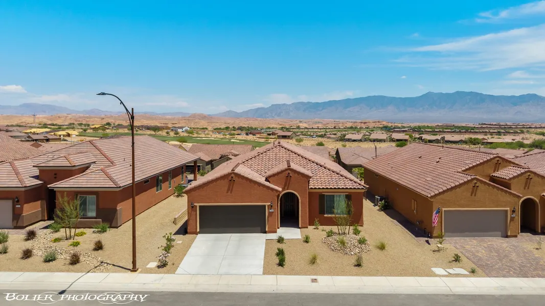 Welcome to your dream home.. This lightly lived-in, like-new home in Sun City’s 55+ community, sits on a premium $58K elevated lot with sweeping mountain views. This backyard faces East offering great sunrise views and shade during the evenings. This immaculate 2024 Hideaway floor plan offers 2 bedrooms, 2 bathrooms and a versatile flex room. The open layout feels bright and inviting, with large windows—complete with custom window treatments—framing the panoramic views. Tile flooring runs through the entry, kitchen and bathrooms, with plush carpet in the living spaces and bedrooms for comfort. The gourmet kitchen features a spacious granite island with seating space for entertaining, generous cabinetry, stainless steel appliances and a walk-in pantry. The fully landscaped backyard includes costly artificial turf, an extended covered patio, and peaceful, uninterrupted mountain views—ideal for quiet mornings or evening gatherings. Pristine, move-in ready, and packed with value... this home is better than new! Sun City Mesquite offers nearby golfing, indoor and outdoor swimming, a fitness center, clubs, and more.. Mesquite is just a short drive from Las Vegas, NV and St. George, UT.