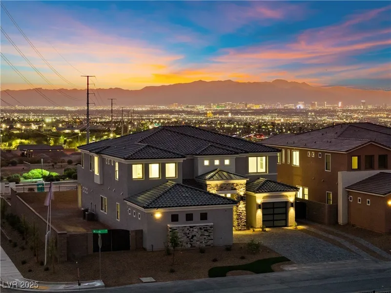 SELF-GUIDED NO AGENT required to tour on YOUR schedule (QR code in pics). A community of Executive-Style NEW HOMES with clear site lines to the Las Vegas Strip. This two-story home offers mountain & strip views, 5035sf, 5 ensuite bedrooms w/walk-in closets, 4-car garage parking, double RV PARKING w/10' gates, 10'+ ceilings, massive laundry w/island, Super Loft w/deck, soft-close cabinets w/under cabinet lighting, quartz counters, luxury flooring finishes, matte black fixtures, wet bars, linear fireplace, oversized patio/deck, & a pool-sized yard. Kitchen includes nook and butler area with walk-in Pantry and space for additional fridge, Bertazzoni Master Series stainless appliances: 48" slide-in range/oven with hood, refrigerator + freezer columns, 2 dishwashers, microwave & warming oven. Primary Bedroom has an oversized walk-in closet w/laundry, wet bar & spa-like bathroom. Neighbors: He...