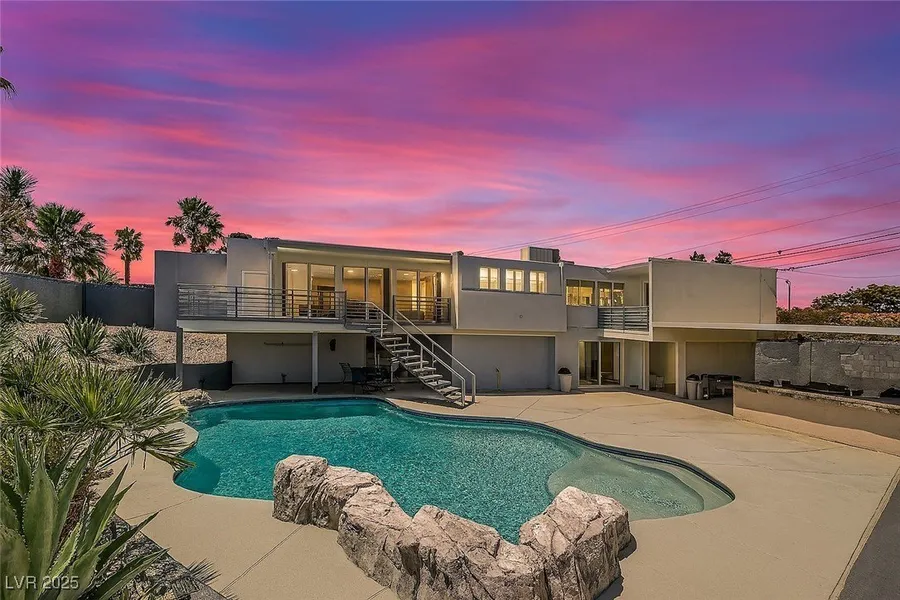 CUSTOM 2-STORY ENTERTAINER’S DREAM ON NEARLY ½ ACRE LOT WITH NO HOA—KNOWN AS OLD VEGAS’ FAMOUS “ELVIS HOUSE!” 4 BED, 4 BATH + DEN, FULLY FENCED WITH MASSIVE DRIVEWAY, SPARKLING POOL, COVERED PATIO, BUILT-IN BBQ, RV PARKING, AND NO REAR NEIGHBORS! RECENTLY REMODELED TO A GORGEOUS MODERN DESIGN. FORMAL LIVING ROOM HAS WOOD-BURNING FIREPLACE. GOURMET KITCHEN FEATURES STAINLESS STEEL APPLIANCES, BUILT-IN MICROWAVE, QUARTZ COUNTERS, BREAKFAST BAR, AND GARDEN WINDOW. OPEN CONCEPT LAYOUT WITH GAME ROOM/FAMILY ROOM AND ENCLOSED SUNROOM. HUGE PRIMARY SUITE INCLUDES BALCONY, 2 SINKS, SEPARATE TUB & SHOWER, AND WALK-IN CLOSET. DOWNSTAIRS BEDROOM NEXT TO ¾ BATH—PERFECT FOR GUESTS OR MULTI-GENERATIONAL LIVING! WOOD TILE, LAMINATE, AND TILE FLOORS THROUGHOUT—NO CARPET FOR LOW MAINTENANCE. 2-CAR GARAGE WITH BUILT-IN CABINETS AND WATER SOFTENER. TOTAL SQFT 3,526. CONVENIENTLY LOCATED NEAR SHOPPING, DINI...