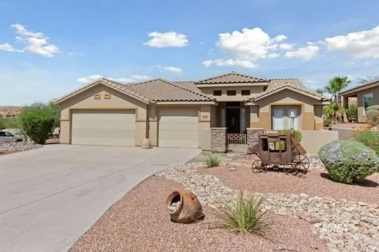This beautifully designed home sits on a desirable corner lot with excellent curb appeal and creative landscaping. A welcoming front courtyard and custom entry door set the tone. Just off the foyer is a versatile den/office with French doors to the courtyard or could be used as a fourth bedroom. Two guest bedrooms share a full bath, while the main bedroom offers patio access, a spacious walk-in closet, dual vanities, step-in shower, and a new Kohler walk-in tub. The open floor plan features neutral tile set on the diagonal, carpet in bedrooms, and a kitchen with custom cabinetry, granite countertops, stainless steel appliances, and a large island with breakfast bar. The great room is bright with large windows, a stone gas fireplace, and backyard views. Step outside to a special oasis with a custom BBQ, waterfall feature, and views of Flat Top Mesa. Located in the gated Rancho Santa Barbara within Mesquite Vistas, you'll also enjoy access to the Oasis"Palmer Golf Course and community amenities. Heat pump is two years old