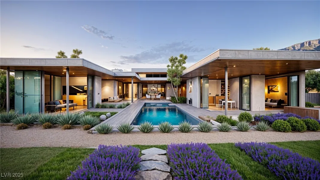 High above the rest with incredible unobstructed views of the entire Las Vegas Valley and Strip, this stunning elevated 8,400 square foot sprawling one of a kind custom estate captures all the most desirable elements associated with luxury living and entertaining. Nestled atop the picturesque hillsides of Henderson, you can be one of the first to take advantage of this unbelievable opportunity to move to Climbing Canyon, a collection of only seven guard gated estates by GLH, each offering an unparalleled blend of luxury and exclusivity. Offering an ultra-modern-styled desert contemporary style, a secluded primary wing, accommodating up to four bedrooms and four bathrooms, alongside amenities such as an office, gym, and media room and a separate pool house! A serene interior garden provides a tranquil escape, complemented by multiple flex rooms to suit various needs. With a five-car garag...