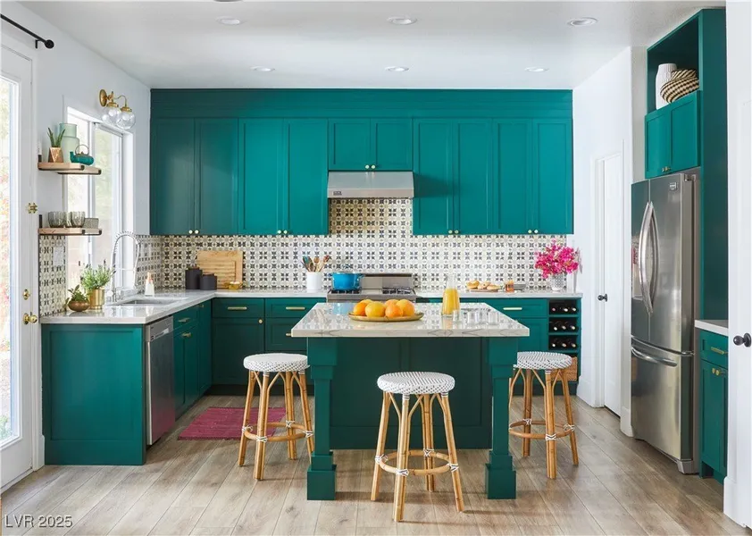 This is your opportunity to own a beautiful Green Valley home reimagined by an internationally acclaimed Interior Designer, featured on HGTV Magazine and other top design shows. Every detail has been thoughtfully designed using bold, saturated colors, layered textures, and a seamless blend of modern and classic. The kitchen is a true masterpiece with marble countertops, patterned backsplash, vintage Viking range, and statement green cabinets that anchor the space. The open concept living and dining areas feature custom paint, built-in bookshelves, a faux fireplace, and French doors that flood the space with natural light. The downstairs bedroom and bath showcase playful color and wallpaper choices, while upstairs offers a serene primary suite and two additional bedrooms. Zoned for top-rated schools and minutes from shopping, dining, freeways, and the airport. This home is equal parts ele...