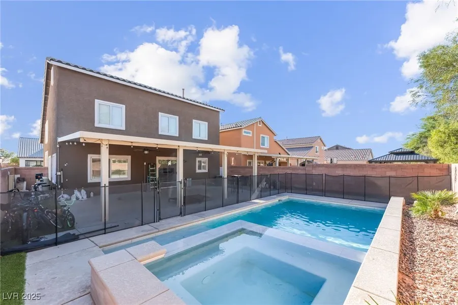 Beautiful 4-bedroom, 2.5-bath home featuring a sparkling pool and spa, perfect for relaxation and entertaining. The spacious kitchen offers granite countertops, stainless steel appliances, and a breakfast bar that opens to the dining and living areas, creating a warm and inviting space. The primary suite boasts a private bath with dual sinks and ample closet space. Generous secondary bedrooms, an open floor plan, and abundant natural light add to the appeal. Step outside to a true retreat with a gorgeous pool, spa, and backyard covered patio ideal for outdoor dining and gatherings. This home blends comfort, style, and convenience—ready for you to enjoy!