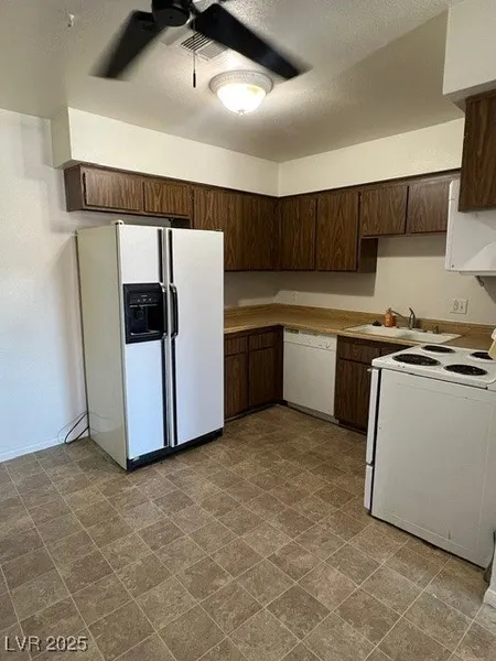Upstairs 2 bedroom, 2 bathroom condo, freshly painted with new carpet, private balcony and two assigned parking spaces, with additional guest parking. Conveniently located near shopping and dowtown Boulder City.