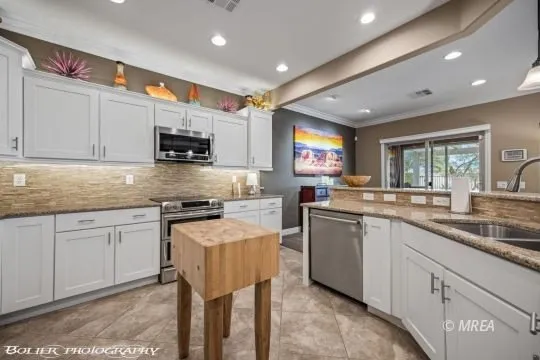 Discover this stunning 2-bedroom, den, 2-bathroom home. This immaculate property sits on a prime Sun City Tannery Cove view lot, SID paid. Located just steps from the pickleball courts and the upcoming Sun City Ballroom, this home places you at the heart of community recreation. The nearby Sun City Mesquite Pioneer Center offers additional amenities and social opportunities for residents. You will appreciate the proximity to Conestoga Golf Club. The home showcases professional desert landscaping and features a portable spa nestled within a screened patio. The yard is fully fenced. Inside, you'll find custom touches throughout, including granite countertops with matching backsplash, white shaker cabinets, and crown molding details. The primary bedroom features a bay window, while the en suite bathroom boasts custom stone and tile flooring. Practical upgrades include remote window treatm...