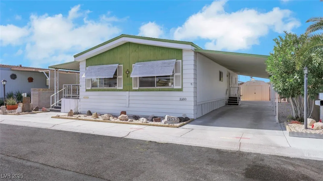 Absolutely stunning 2 bedroom/2 bath manufactured home in Desert Inn Mobile Estates II. Spacious front porch and tandem carport. Converted to real property. Age restricted 55+ community with amenities galore. Sparkling community pool. Clubhouse, RV Parking and roaming security. Water is included in the HOA. All appliances are included. Open and functional floor plan with additional den or flex space. Updated kitchen with refinished cabinets, solid countertops, custom backsplash and breakfast counter. Huge living room area with vaulted ceilings and formal dining area. New carpet and freshly painted. Tile. New sub floor and roof. Property is immaculate and shows really well. Two storage sheds. One has electrical, workbench and window mount A/C unit. Will not last long at this wonderful price!