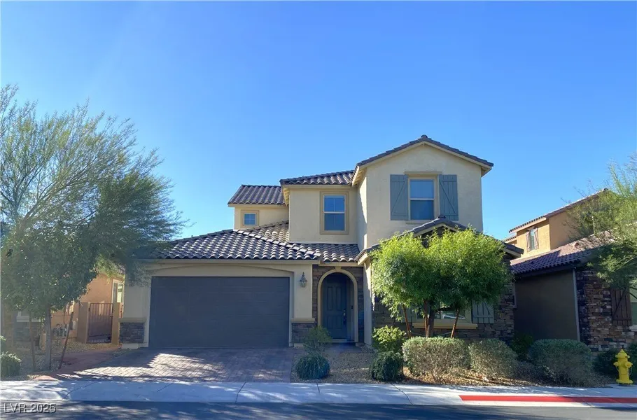 Beautiful home in the gated Ashmore community in southwest Las Vegas built in 2017. Less than a mile from the 215 and within 5 miles of shopping centers on Rainbow (Costco, Home Depot, Walmart, IKEA, grocery stores, restaurants). This home features an open floor plan with kitchen opening up to dining room/living room combo that is perfect for family gatherings. Kitchen has granite counter tops and all stainless steel appliances (refrigerator included), plenty of counter space and cabinets, and walk-in pantry. Downstairs features: Master bedroom with vaulted ceilings, ensuite bath, washer in bath, and large walk-in closet; guest bedroom with ensuite bath and walk-in closet; powder room; and ample storage closet underneath staircase. Upstairs features: 3 bedrooms; 2 bathrooms; spacious loft that opens to deck; and large laundry room with plenty of linen storage. 2 car garage and very low m...