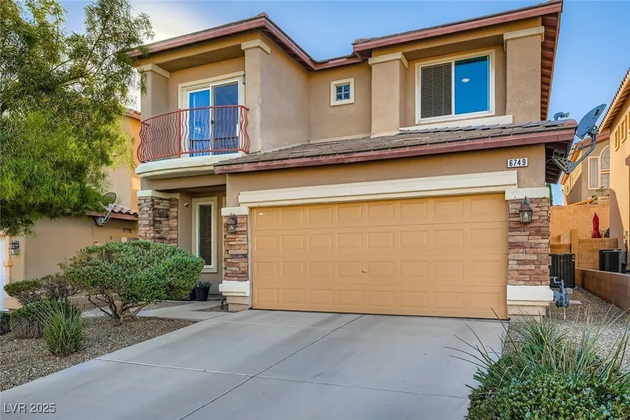 Fantastic curb appeal and pride of ownership in this well-kept home! The interior has been freshly painted and is move-in ready. Features include ceiling fans, newer triple-pane windows throughout, and 2" blinds. The gorgeous kitchen offers ample cabinet and counter space, an island, eat-in nook, quartz countertops, sleek microwave, and a 5-burner stove. A cozy two-way fireplace separates the living and family/dining areas, creating a warm and inviting atmosphere. Home also includes a water softener and newer hot water heater. Refrigerator, washer, and dryer are negotiable. The separate primary suite features a walk-in closet and spa-like bathroom. A versatile loft area with balcony adds extra living space. Step outside to your private backyard oasis with a paver patio, elevated planters, twinkle lights, and easy-care synthetic grass. Community has park area! Great location - 30 minutes to Mt. Charleston, 20 minutes to Red Rock and 30 minutes to the Strip. Make this house your HOME.