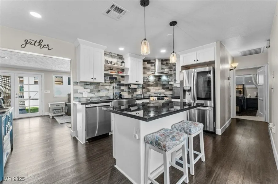 This 1,726-square-foot home on Seventh Street in Boulder City features three bedrooms, two remodeled bathrooms, a remodeled kitchen with an open floorplan, a front living room, and a family room with a raised wood-burning stove. The separate primary bedroom includes a walk-in cedar closet, and the laundry room offers built-in storage with dog-door access to the backyard. Outdoor highlights include a front yard with pomegranate and lemon trees, a backyard with turf, a raised patio, and outdoor lighting for entertainment. Parking options include a two-car detached garage, a two-car carport with alley access, and RV parking available on the paved front driveway. The home is NOT in an HOA, heated with gas, and all other systems and appliances use electricity. Washer, dryer, and refrigerator are included.