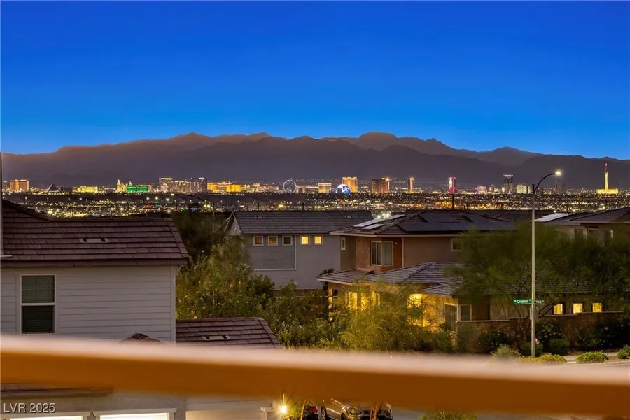 This home features paid-off solar panels. Beautifully upgraded home in Cadence master-planned community. Primary suite located downstairs offers a designer closet with built-in shelving and a primary bathroom with custom walk-in shower. Second bedroom includes a queen-size Murphy bed. Gourmet kitchen showcases stainless steel appliances, double oven, custom backsplash, and spacious island with sink. The open living area is enhanced with surround sound and connects seamlessly to the outdoor retreat through telescoping sliding doors with electric blinds. The covered patio includes dual ceiling fans, recessed lighting, and provides the perfect setting for relaxation or entertaining. Upstairs, you’ll find a third bedroom with full bathroom and an expansive loft with a private balcony that captures stunning views of the Las Vegas Strip. Located just steps from Cadence Central Park, Smith’s Marketplace, shopping, dining, and more, this home combines style, comfort, and unbeatable location.