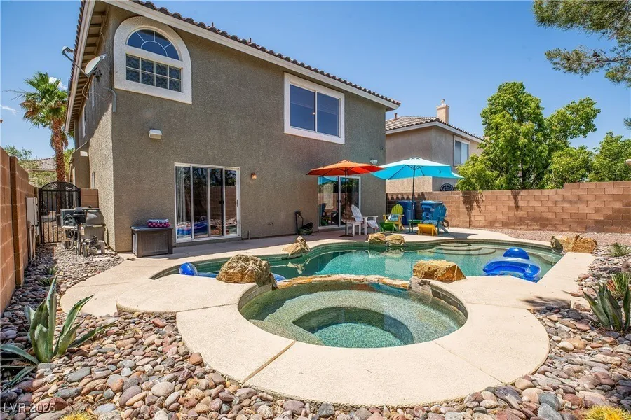 Southern Highlands gem offering more than 2,400 sq ft of living space. 2-story located in the guard gated community of Royal Highlands. All four bedrooms are situated upstairs, while the main level offers generous living spaces ideal for both everyday living and entertaining. Exterior was professionally re-painted including the fascia! 2-car garage with new door insulation, garage door springs, & recently replaced water heater. All bedrooms w/ ceiling fans & closets. Step outside to your private backyard retreat featuring a pool and spa, ideal for relaxing or hosting guests year-round. The pool was recently drained & high pressure cleaned. Cleaning jets replaced. Updated irrigation system. Residents of Southern Highlands have access to stunning parks, dog parks, trails, world-class golf, and dining options. Located next to the I-15 & 15 minutes away from the strip.