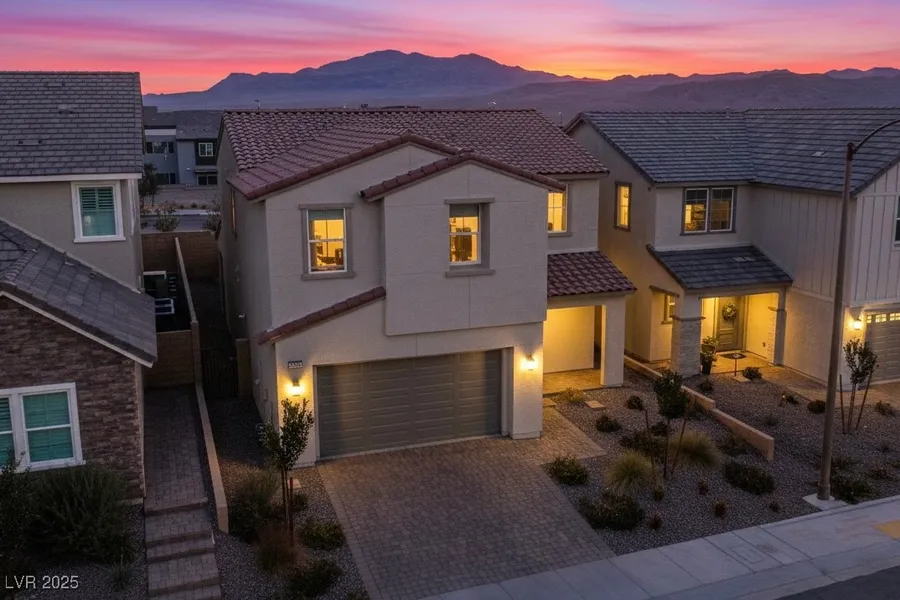Built in 2024, this beautifully upgraded Skye Canyon home offers modern design, energy-efficient construction, and more than $70,000 in Toll Brothers options. The open-concept layout features luxury vinyl plank flooring, matte black hardware, upgraded Craftsman stair rail, and a multi-slide glass door that expands the great room into the backyard. The kitchen includes Mission-style white cabinetry, quartz countertops, upgraded backsplash, stainless steel appliances, a large island, and walk-in pantry. Upstairs offers three bedrooms plus a loft, including a spacious primary suite with walk-in closet and upgraded tile shower. Additional upgrades include recessed lighting, under-cabinet lighting, extended electrical circuits, CAT6 wiring, camera prewire, fiberglass shower pan, and first-floor floor outlet. Located in a gated community with access to pool, spa, parks, and trails, this move-in ready home combines quality finishes with the outdoor lifestyle of Skye Canyon.