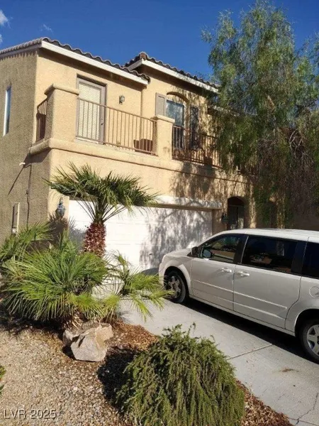 Welcome to this spacious 4 bedroom home featuring a 2 car garage and a thoughtfully designed open floor plan ideal for both everyday living and entertaining! The home offers separate living and family rooms, providing flexible spaces for relaxation and gatherings. Ceiling fans are installed throughout the home, including all 4 bedrooms, ensuring year-round comfort. The kitchen is well-appointed with a island, granite countertops and tile flooring, offering ample workspace and storage! The primary bedroom includes a walk-in closet and an en-suite bath with dual sinks. One of the secondary bedrooms features a private balcony, adding an extra touch of versatility and outdoor enjoyment. The backyard is designed for low-maintenance living with a covered patio and desert landscaping—perfect for enjoying the outdoors. Located just minutes from schools, shopping, freeway access, the M Resort Hotel & Casino and more, this home offers both comfort and accessibility in a desirable location!