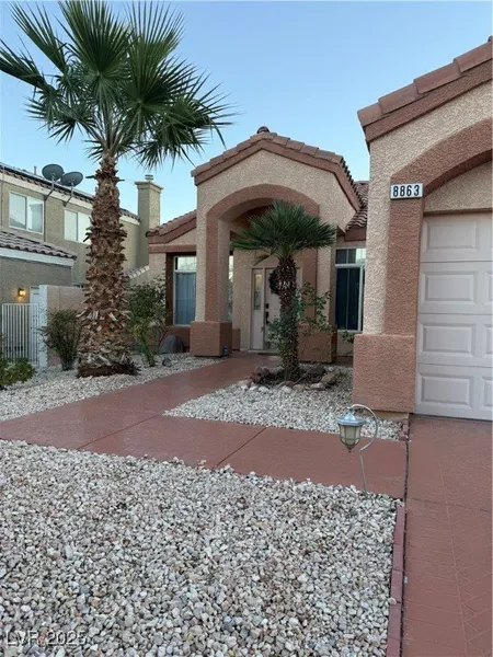 Stunning one-story home near Downtown Summerlin offering unbeatable location, lifestyle, & value without the Summerlin price tag. NO HOA. Rare 3-car garage home featuring 3 bedrooms, 2 bathrooms, vaulted ceilings, & open-concept layout ideal for modern living. Wood-look ceramic tile throughout main living areas w/carpeted bedrooms. Updated kitchen w/stainless steel appliances, granite countertops, ample storage, & an eat-in breakfast area flowing into a spacious family room. 2 fireplaces add warmth & charm, one in the living room & one in the primary bedroom. The oversized primary suite includes an en-suite bath & a private den perfect for a home office, gym, or flex space. Solar panels provide energy efficiency, lower utility bills, & long-term savings. Resort-style backyard features a private pool, built-in BBQ, & covered patio, perfect for entertaining. Prime Las Vegas location close ...