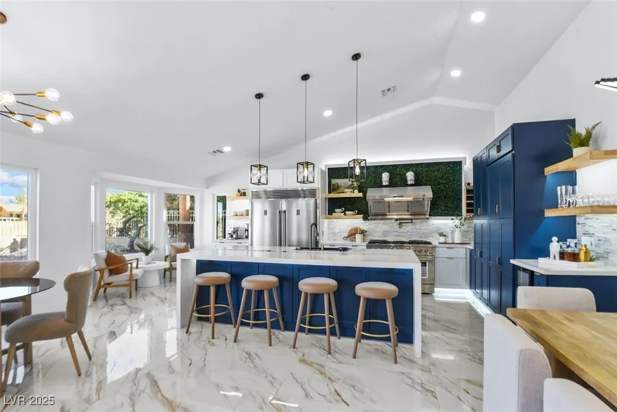 Boxwood on Golfside Dr by Michael Mair Luxury is a one-of-a-kind, fully custom 2 bed, 2 bath modern remodel on the Palm Valley Golf Course in Sun City Summerlin. Designed over 9 months with high-end finishes, this 1,653 sq ft home features porcelain tile flooring, designer lighting, new windows, and an open layout made for entertaining. The custom entertainment wall includes acoustic wood paneling, 85” TV, electric fireplace, floating shelves, and LED lighting. The chef’s kitchen boasts luxury appliances, walk-thru pantry, multifunction sink, reverse osmosis, and in-cabinet lighting. Spa-like primary bath with floating double vanity, deep soaking tub, black river rock, and LED accents. Golf course patio includes a fire/waterfall feature, artificial turf, boxwood privacy wall, and shaded west-facing exposure. 2-car garage with golf cart space and silent opener. Truly a standout in design ...
