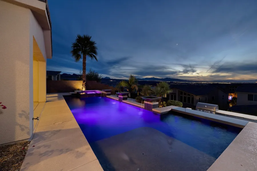 Welcome to the Peaks at Lake Las Vegas. This striking modern two-story residence offers 4 bedrooms, 3.5 baths, and 3,218 sq. ft. of thoughtfully curated luxury. An open-concept design is elevated by Sonos surround sound, a chef’s kitchen with double ovens, ice maker, oversized waterfall island, and a chic dry bar with dual-zone wine refrigeration. Outdoors, a true private retreat awaits—sparkling pool with swim-up bar, lounging wet deck, and built-in BBQ for effortless entertaining. Upstairs, two balconies impress: one with a live-edge bar capturing Strip lights and sunset vistas, the other framing tranquil mountain views. The main level features a serene primary suite and an ensuite guest room with convenient laundry nearby. Exceptional condition, best value per square foot, and panoramic views within an award-winning community offering a 320-acre private lake, water sports, fine dining...