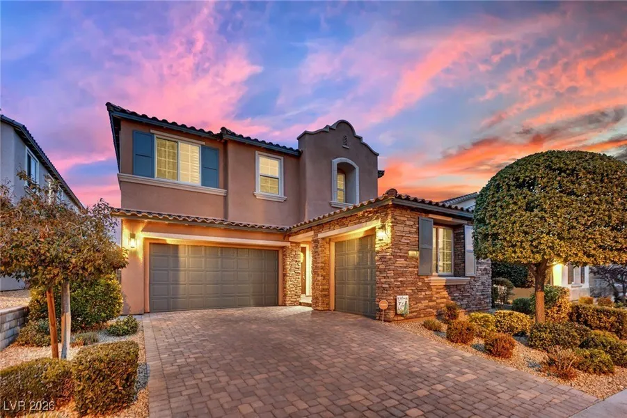 Indulge in refined living in this expansive 2,917-sqft home located in the highly desirable Summerlin community. This stunning residence features five bedrooms, four bathrooms, a loft, and a three-car garage. Bright, open spaces are filled with natural light, while the gourmet kitchen offers ample workspace and flows seamlessly into the dining and living areas—perfect for everyday living and entertaining. Upstairs secondary bedrooms enjoy beautiful views of Red Rock Canyon. The primary suite is a true retreat, featuring a separate shower and soaking tub, double vanity, and a private balcony overlooking the backyard oasis and the Las Vegas Strip, with views of Fourth of July and Aviators game fireworks. Step outside to a resort-style backyard with an app-operated heated pool and spa, elegant pavers, and a covered patio with fireplace and mounted TV—ideal for year-round indoor-outdoor livi...