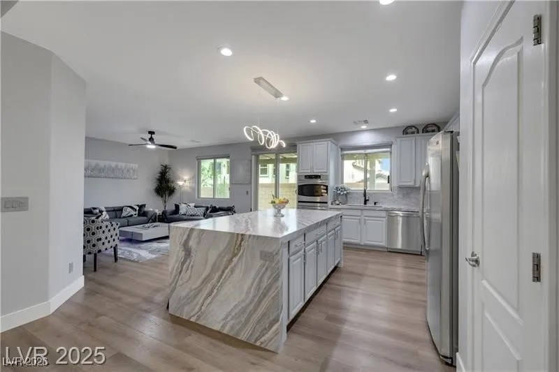 Welcome home to your remodeled southwest stunner! Located in the Summerlin area, in a gated community, this highly upgraded two story home features dual master bedrooms with one on each floor, along with one additional bedroom both downstairs & upstairs, brand new floors throughout, fresh paint, new quartz countertops in kitchen and all bathrooms, including a waterfall countertop in the kitchen, high ceilings with an open floor plan, beautiful/modern fixtures throughout, mint condition GE profile appliances including a cooktop & double built in ovens, two huge walk in showers with dual shower heads & rain heads, large walk in closets with custom California built in closet in downstairs master, custom bar area, backyard has a built in kitchen with hard lined BBQ along with a covered patio & brand new artificial turf, tankless water heater, water softener & water filtration system, epoxy g...