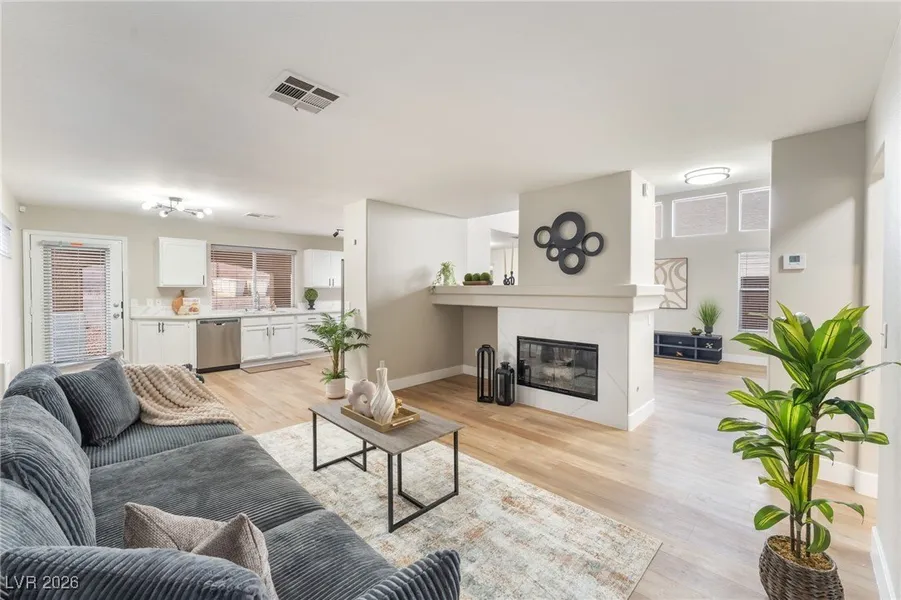 Welcome to this updated two-story home located in the desirable northwest Las Vegas area. Featuring 3 bedrooms, 2.5 bathrooms, and a 2 car garage, this home offers a well designed layout with both comfort and functionality. The spacious family room flows into a cozy dining area, while the kitchen boasts quartz countertops, stainless steel appliances, and a charming garden window. A separate living room with a fireplace provides the perfect space for relaxing or entertaining. The oversized primary suite includes a private seating area, a large ensuite with double sinks, a walk-in shower, and a walk-in closet. Enjoy outdoor living in the spacious backyard with low-maintenance rock landscaping and a covered patio. A wonderful opportunity to own a move in ready home in a great location.