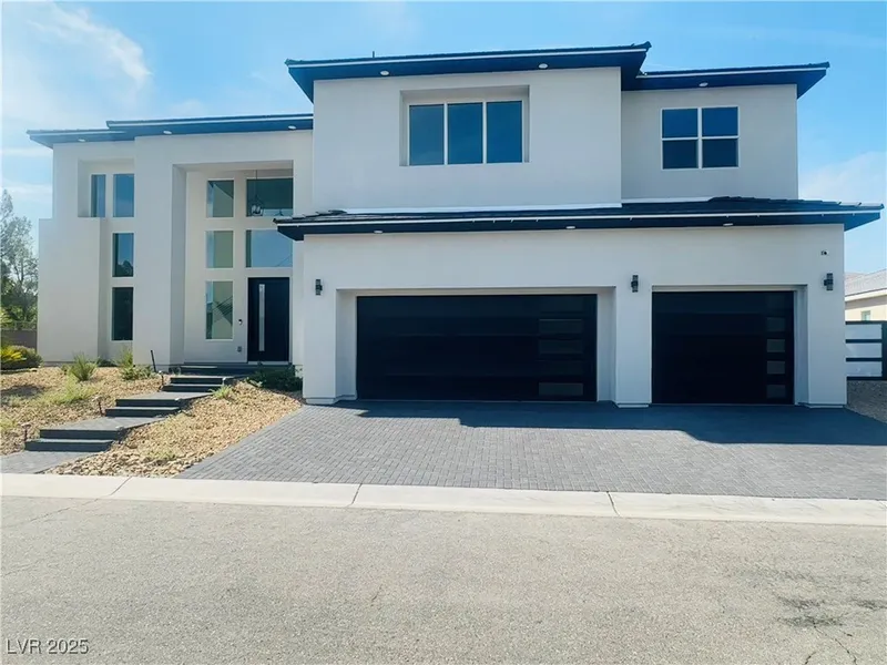 Luxury custom home in Southern Highlands, located right next to the prestigious Southern Highlands Golf Club. Like new, built in 2023, this modern residence offers 5,300+ sq. ft. with 5 bedrooms, 4.5 baths, office, gym, lifestyle room, and media room. A dramatic 22’ entry with floor-to-ceiling fireplace and built-in bar sets the tone. Gourmet kitchen features custom cabinetry, quartz counters, double waterfall island, walk-in pantry & high-end stainless appliances. Sliding glass doors create seamless indoor-outdoor living to a resort-style yard with beach entry pool, spa, waterfalls, firepit & covered patio. Solar panels power the pool & spa. Natural light fills the home through oversized windows. 3-car garage, RV/boat parking, on a ½ acre corner cul-de-sac lot within a gated enclave of custom homes (new gate installation underway). Shows like a model!