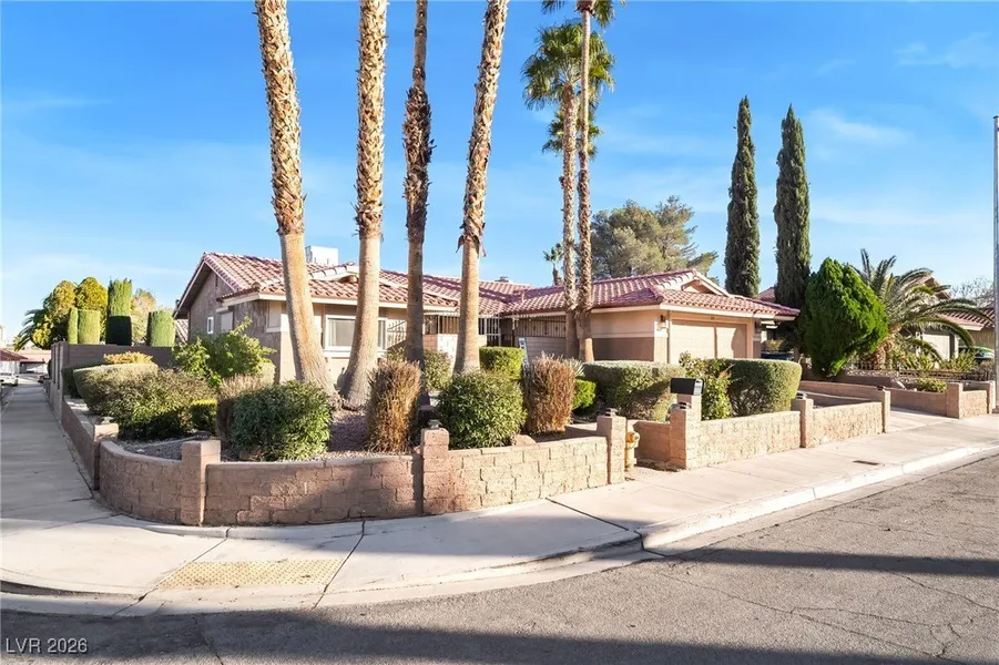 This stunning midcentury modern 3-bedroom home on a desirable corner lot w/no HOA, offers mature, meticulously landscaped grounds that lead to a secure courtyard entry. The light-filled interior is highlighted by vaulted ceilings & 2 fireplaces. Rolling security shutters on all doors & windows enhance both privacy & peace of mind. The kitchen features granite countertops & a breakfast bar, & flows seamlessly into the living space. The expansive backyard is an entertainer’s retreat, showcasing two covered patios (outfitted & ready to install an outdoor kitchen), & a solar-heated pool & spa for year-round enjoyment. Pride of ownership throughout includes a new HVAC system in August 2024, as well as new interior paint, pool filters, front yard irrigation lines, & 3-way valve for the pool in 2025, & a whole house water softener. A rare opportunity to own a truly distinctive home w/style, just minutes from Chinatown & the Las Vegas Strip, along w/gorgeous views of the Strip skyline.