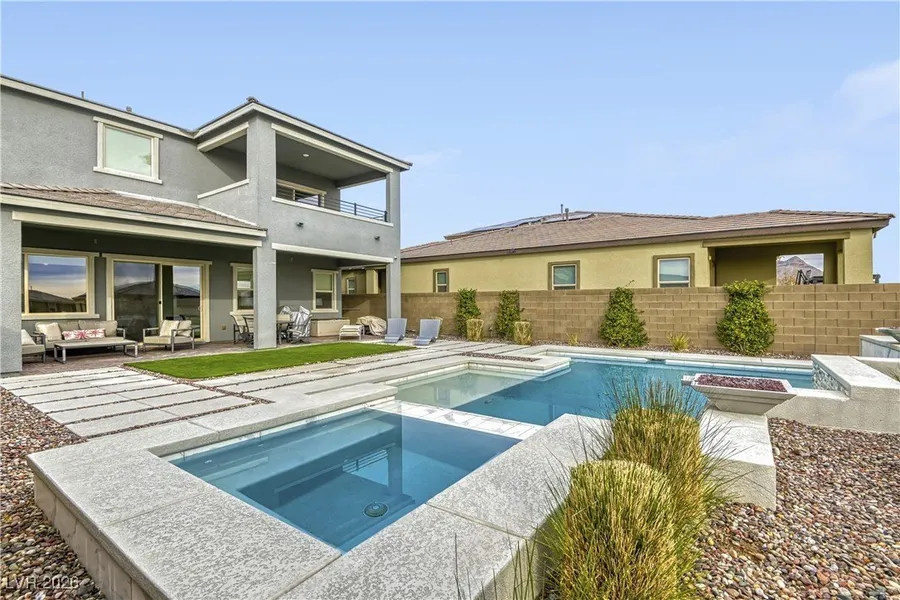 Discover a stunning 4-bedroom (dual primaries) + loft, 3-bath home, spanning 3,000 sf in the heart of Summerlin. Tucked within a gated community, this exquisite property offers a seamless open floorplan with modern RH furnishings, perfect for turnkey ease. The primary bedroom is conveniently located downstairs, providing privacy and comfort. An oversized loft provides versatile living space upstairs. Step outdoors to enjoy a covered patio, pool, and spa, ideal for relaxation and entertainment. Located on a tranquil cul-de-sac with no rear neighbors, this property offers both serenity and convenience. Just minutes from community parks, Summerlin Mall, Red Rock Casino, and diverse shopping and dining options, this home promises an exceptional lifestyle.