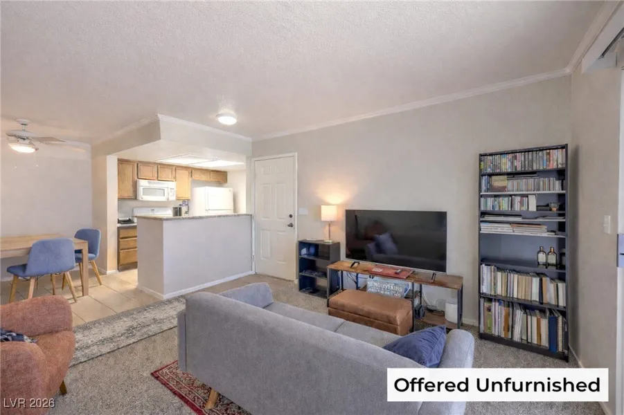 Summerlin unfurnished first-floor condo with 1 bedroom and 1 bath in a secure gated community with a well-designed, efficient layout. Updated kitchen and bathroom feature granite countertops, new sinks, and modern faucets. A brand-new washer and dryer and all major appliances are included with the condo. The living area opens to an extra-large private balcony/patio, well suited for everyday outdoor use. The bedroom offers a walk-in closet with ample storage. Community amenities include two pools, spa, fitness center, and clubhouse. Well-maintained grounds provide direct access to Pueblo Park. The community features two separate gated entrances, making access and parking convenient. Ideally located minutes from US-95/I-11, Summerlin Parkway, shopping, dining, golf courses, and Santa Fe, Rampart, and Suncoast Casinos. Unfurnished; furniture shown is for staging purposes only.