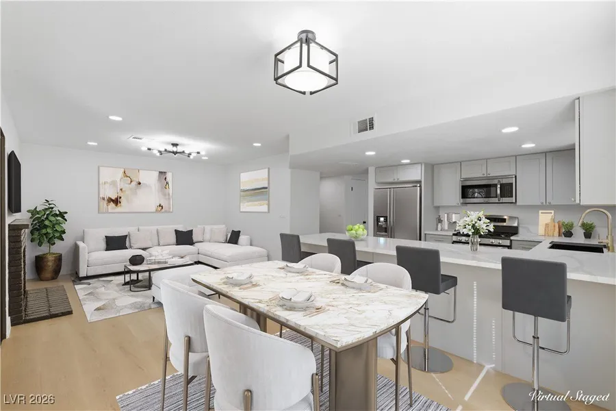 Located just minutes from Nellis Air Force Base, this newly remodeled two-story, 3-bedroom home is truly move-in ready. The property features a spacious backyard with an attached covered patio, perfect for outdoor living. Inside, enjoy modern light fixtures, a custom tiled fireplace, plush carpeting, and laminate wood flooring throughout. The upgraded kitchen offers a garden view and showcases custom cabinetry, stylish countertops with gold hardware, recessed lighting, stainless steel appliances, and a large breakfast bar with seating. The newly renovated bathrooms feature modern vanities with framed mirrors, custom lighting, and beautifully tiled showers with built-in niches and rainfall showerheads. The primary bathroom includes a separate soaking tub for added luxury. A must-see home that blends modern upgrades with comfort and style.