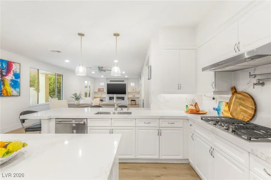 Welcome to this beautifully remodeled home with over 3800 sq ft in the highly sought-after guard-gated Eagle Rock community of Summerlin, listed well below recent remodeled comps within Eagle Rock. A private courtyard entry features a tranquil koi pond and a detached 230 sq ft casita. The remodeled chef’s kitchen offers quartz countertops, Café luxury appliances, a wine refrigerator, and an RO water system. The spacious primary suite includes a private balcony, a sitting area with a dual-sided fireplace, and a spa-like bathroom with dual walk-in customized luxury closets, a designer walk-in shower, and a freestanding soaking tub. The backyard is ideal for entertaining with lush landscaping, two covered patios, a bamboo garden, an outdoor kitchen, and a resort-style pool. Recent upgrades include new HVAC systems, pool heater, water softener, and hot water heater. Experience an elevated lifestyle in a prime location just minutes from Tivoli Village, Boca Park, the JW Marriott, and more.