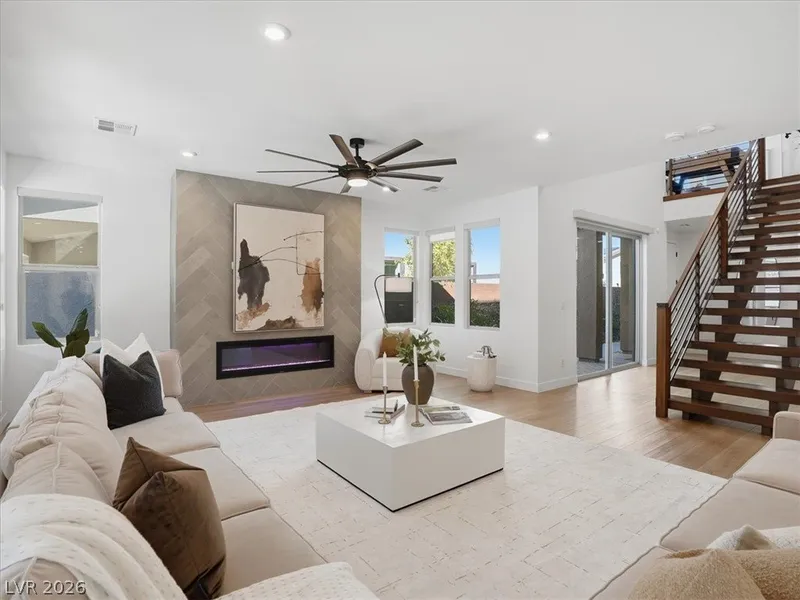 Step into a serene desert escape in South Summerlin. This nearly 3,000 sq ft 4-bed, 4-bath home blends modern design with calming natural tones and warm textures throughout. The living room centers around a custom fireplace media wall, while wide plank flooring, fresh carpet, and refinished stairs add a clean, polished feel. The bright kitchen features white cabinetry, stainless appliances, and statement lighting. The spa-inspired primary bath offers a rain shower and relaxing atmosphere. Enjoy indoor-outdoor living with a covered patio, pool, and mountain views, enhanced by the privacy of nearby cliffs. Designer details include custom window treatments, upgraded hardware, and rock accent feature. Located near Durango Casino, UnCommons, The Bend, and Cowabunga Bay with convenient access to dining, shopping, and entertainment.