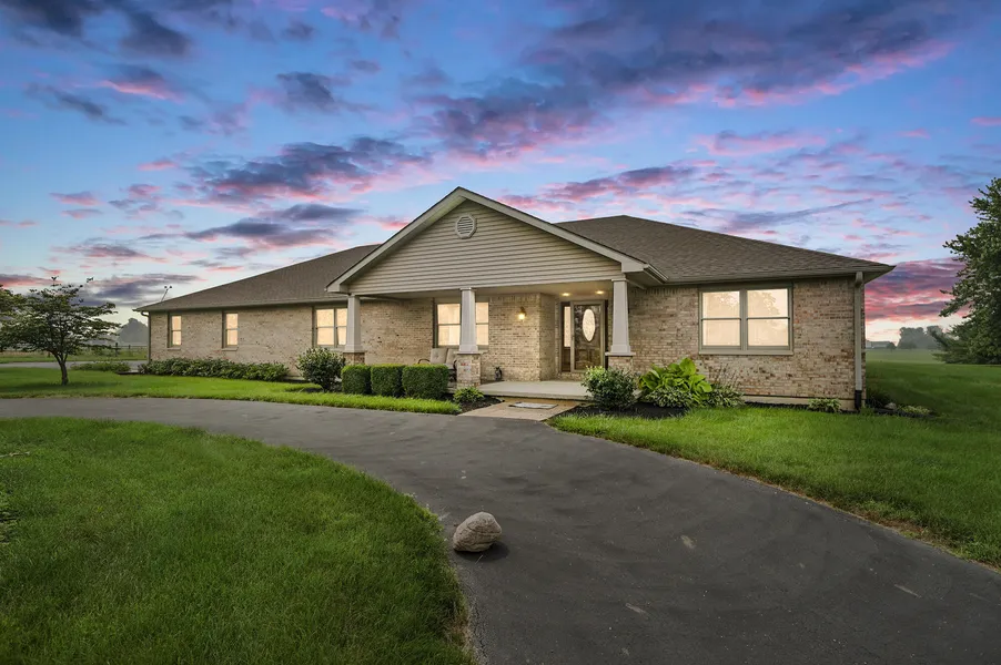 Custom brick ranch nestled on 5+ acres with gorgeous front and back views and a pond. Entering the front you will find a welcoming entry with a bedroom currently used as an office to the right. The living area is open to the dining area and custom hickory kitchen with tons of counter space, built in serving bar and a spacious pantry. Living room has a gas fireplace. Master bedroom has a large walk- in closet, gas fireplace and en suite bath with double vanity, shower and jet tub. Bedroom french doors lead to the 30x53 room featuring a 16x32 in ground heated pool. This room features in floor radiant heat, separate central air unit and wood burning fireplace. New Anderson rear door and picture window just installed in the pool room. There are 2 more bedrooms with spacious closets and 2 more full baths and a utility room on the opposite side of the home giving space and privacy from the master bedroom. Solid 6 panel hardwood doors and trim. 4 car attached garage. Unfinished basement with poured concrete walls and 9 ft ceiling has a tornado/safe room with steel door and concrete walls. Basement has entrances. 1 from the 4 car GarageBand 1 from inside the home. Basement is ready to be finished to your liking. There is an additional 30X52 outbuilding with 2 front 10ft doors and rear overhead doors and a car service lift. It also has a fully floored walk up loft area for storage or to be finished as an office or recreation area. Out back there is a nice patio with a pergola and a small fenced area with doggy door access. Light up basketball hoop. Back up generator. Enjoy the peaceful tranquility of nature and wildlife and the pond. Central vacuum. New roof (tear off) and high efficiency attic fans 2021. Home security system installed.