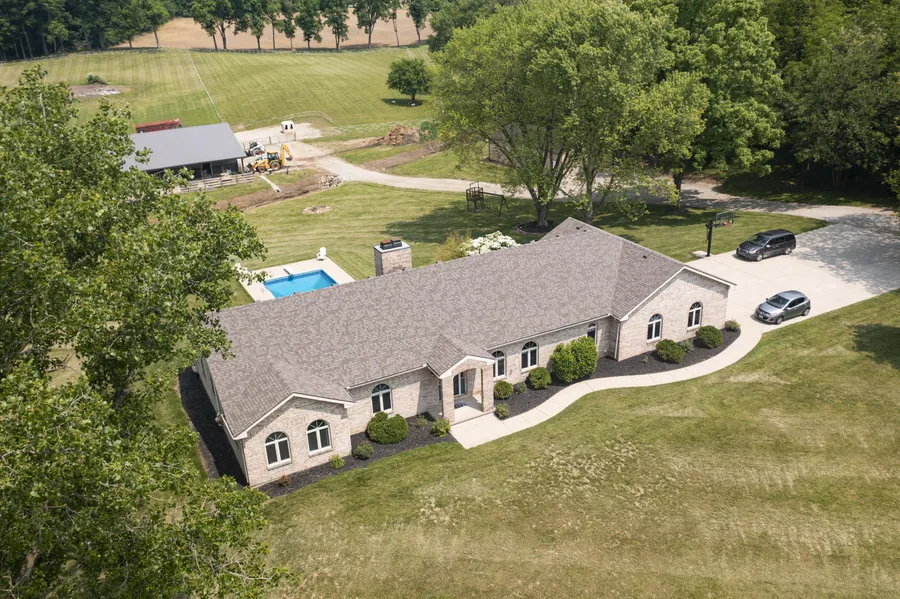 RARE FIND! You get your own piece of paradise with this Equestrian/Gentlemen's farm. You have a stunning BRICK RANCH with a full, FINISHED WALKOUT LOWER LEVEL that sits on almost 11 ACRES. You'll love the stylish & functional upgrades of around $250,000 completed. The 30'x50' insulated metal pole barn is perfect for a car enthusiast or a farmer while the 40x60' horse barn is equipped with stalls and rubber mats. You'll love all the stylish upgrades in the remodeled home. The GOURMET KITCHEN is truly the gathering place with gorgeous granite counters including a large Breakfast bar and high-end appliances. You'll be amazed by the EXPANSIVE BUTLER'S PANTRY. The kitchen is open to the sunny GREAT ROOM which is accented by an beautiful stone fireplace and skylights. The first level boasts 2 PRIMARY BEDROOMS on separate ends of the home for privacy. They have all the features you'd expect of a home of this caliber, including SPA-LIKE BATHROOMS, one of which has radiant heat in the floors and one that is handicap accessible. This level also has a LIVING ROOM, a DINING ROOM, a HALF BATH, and a sizeable LAUNDRY. The fun begins in the Lower Level which has a MASSIVE REC ROOM that can accommodate whatever your heart desires. A brick fireplace anchors the room. This level has 2-3 BEDROOMS, a FULL BATH, and what had been a wine room. There is still plenty of storage space. The home is designed to give you scenic views from every room. Enjoy the spectacular views from the COVERED PATIO, the TREX DECK, or from the 18'X36' sand-filtered KNICKERBOCKER POOL with a diving board. See an extensive list of upgrades and the floor plan in the 3D imaging. Call now for a private tour.