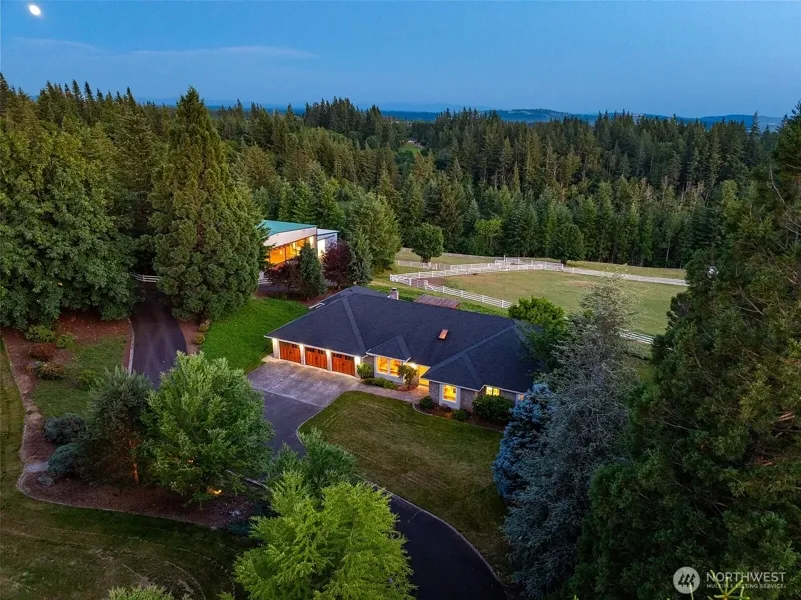 Premier 10.5-acre equestrian estate with a 22,000 SF Olympic-size clear-span dressage arena, remodeled designer home, and large multi-bay shop. The 3-bed, 2.1-bath, 3,596 SF single-level home features a gourmet kitchen, vaulted great room, maple floors, cedar ceilings, and expansive views from a 1,000 SF deck. The primary suite includes dual walk-ins, jetted tub, and custom shower. Equestrian amenities: ten 12x17 stalls, heated tack room, hot/cold wash rack, 70' round pen, and five Centaur-fenced pastures. Gated entry, fiber internet, CCTV, and hidden safe room. Zoned R-5. Just 25 min to PDX.