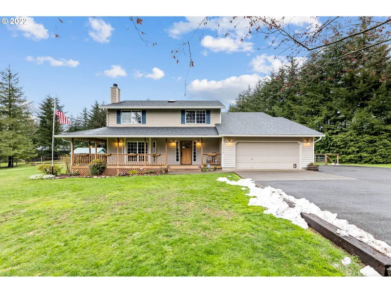 This beautiful, well maintained country property sits on just over 5 flat acres. Great space to entertain inside & out! Open concept on main. Enjoy the lighted riding arena, 60x40 barn w/ 3 stalls, heated tack room, wash rack with hot H2o. Property is fully fenced w/ cross fencing for rotational grazing. 23x18 Covered RV parking. 12X14 shed w/ concrete floor & power. Sit back & enjoy the views and privacy on covered wrap around porch, sit by fire pit or relax in the sauna. Only 30 minutes to PDX