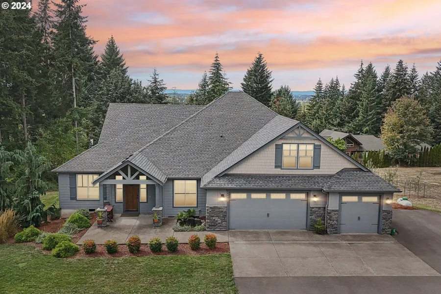 This property offers a welcoming entry with a serene water feature and covered front porch, ideal for sitting out. It features a keyless entry through an 8-ft 9-lite door with sidelites, enhanced by board and batten wainscoting, high tray ceiling with crown molding, and engineered hardwood sets a tone of elegance. The formal dining room, accessible through arched entryways, continues the elegant details with tray ceiling, board and batten wainscoting, and engineered hardwood. The great room family room boasts a gas fireplace with stone surround extending to the ceiling, creating a cozy ambiance. Large windows offer views of the deck and backyard. The gourmet island/breakfast bar kitchen features stainless appliances, an abundance of soft-close cabinetry some with glass panes and space above for accessories, quartz countertops, complemented by a subway tile backsplash and glass tile accents. Adjacent is a dining area with slider access to the covered deck. French door entry to the primary en-suite includes a walk-in closet, access to the covered deck, and tray ceiling with crown molding. French doors lead to the bathroom which features a dual sink quartz vanity, soak tub, shower tiled up to the ceiling, private water closet, skylight, and tile floor. Additional spaces include a second and third bedroom with closets, French door entry to the den/office, bonus room on the upper level, and a laundry/mud room. The home boasts great interior features like a split bedroom design, tray and high ceilings and baseboards, and exquisite millwork. The exterior includes a large covered Trex deck with steel cable railing, fully landscaped, 4 apple trees, and sprinkler system. 3-car garage and RV parking. The property is lined with trees. Territorial view to Oregon. Land available to build your own shop! Mortgage savings may be available for buyers of this listing.