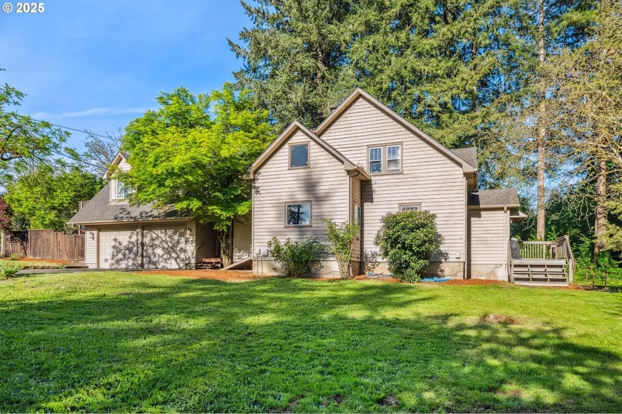 Tucked away on a quiet, private road just minutes east of Battle Ground, this spacious 1930s farmhouse sits on 2.5 acres and offers charm, flexibility, and beautiful natural surroundings. With 5 bedrooms, 2 bathrooms, and 3,220 sq ft of living space, the home is surrounded by nature, including mature apple, pear, and walnut trees. Inside, you'll find a formal dining room, an inviting living room, and an upstairs office or workout room—perfect for today’s versatile lifestyle. The oversized double car garage with high ceilings provides plenty of space for storage, projects, or larger vehicles. The basement is usable and features exterior access, making it ideal for a bonus room or guest quarters. Outdoors, mature pine trees encircle a cozy fire pit area where you can unwind and hear the breeze in the trees. A secluded sitting area by the pond completes the peaceful, natural atmosphere—perfect for quiet moments or simply soaking in the beauty of the landscape.