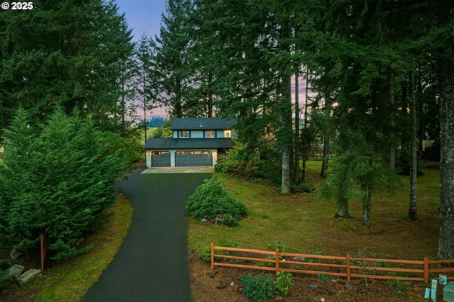 Welcome home! Beautifully maintained private acreage property with an open floor plan, LVP flooring, granite counters, and custom cabinets. The kitchen features stainless Frigidaire double ovens, convection microwave, and a farmhouse sink. Huge main-floor primary suite addition completed in 2023 with vaulted ceilings, dual-sided fireplace, heated tile floors, freestanding tub, and curbless shower. Upstairs offers four more bedrooms, including a second ensuite. Outside, enjoy the oversized covered patio, covered BBQ area, organic deer-proof gardens, 3-car garage, private well, and generator plug. Just 15 min to Battleground, and 40 minutes to PDX.
