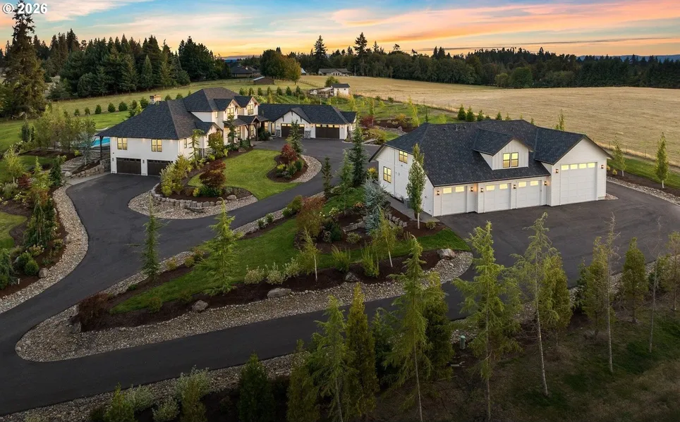 Experience unparalleled luxury in this breathtaking 7,649-square-foot main home, set on a peaceful 9-acre property, complete with a separate RV shop featuring additional living space. The heart of the home is a gourmet kitchen outfitted with top-tier Wolf stainless steel appliances, a Subzero refrigerator, and a heated island top. A vent hood, walk-in pantry, and butler's pantry provide abundant storage and prep space for the most discerning chefs. Designed for entertainment, the family room is wired for surround sound, while multiple gas fireplaces-including an outdoor wood-burning fireplace-create inviting spaces to gather. Step outside to enjoy the pool, outdoor kitchen, and the warmth of the wood fireplace on cooler evenings. Indulge in ultimate relaxation with the sauna, hot tub, and an opulent master bath featuring a freestanding tub. For RV enthusiasts, this property offers drive-through bay parking with hookups, along with an impressive total of 11 garage spaces. The additional 1,487 square feet of detached living space is perfect for guests or private retreats. Striking exterior beams crafted from Douglas fir add architectural charm to this exquisite home. A true masterpiece of luxury, comfort, and functionality. Don't miss this rare opportunity!