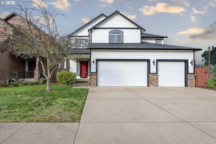 UPDATED HOME WITH 3 CAR GARAGE. 4 bedrooms + office, 2 1/2 bathrooms, 2599 sqft, built in 2006. New exterior paint. All new flooring inside including beautifully refinished Brazilian cherry floors on the main level. Two story entry w/ balcony above. Office at the entry w/ crown molding & French doors. Kitchen w/ island, corner pantry, gas range w/ hood vent & stainless appliances that opens to the dining area & great room w/ gas fireplace. Utility room off the garage w/ sink and storage too. Primary bedroom upstairs has ceiling fan, walk-in closet, jetted tub & shower. Bedrooms 2-4 are upstairs also. 4th bedroom is a large "bonus" room w/ a closet. Forced air heat w/ AC. 3 car garage is finished and amazing. Covered back patio overlooks the smaller fenced yard w/ firepit, raised beds & storage shed. Convenient location near schools, restaurants & shopping. This is a great house.