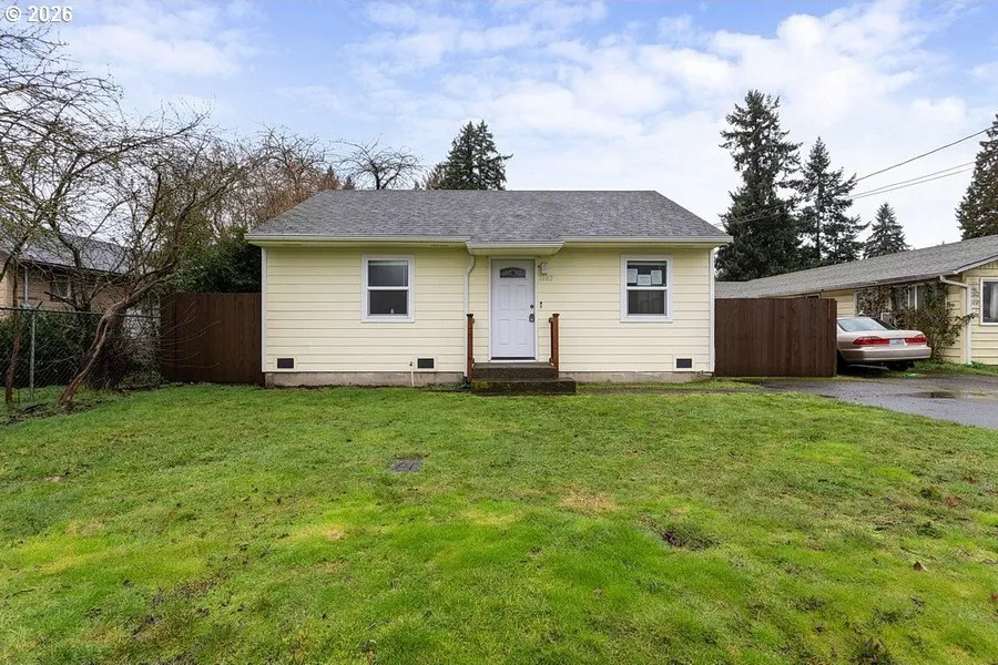 Charming 1943 bungalow offering 2 bedrooms and 1 bath in 729 sq ft of living space. Features hardwood floors throughout the main areas and bedrooms, gray interior paint, high ceilings, and mini-split system for efficient year-round heating and cooling. Kitchen includes white cabinetry, stainless dishwasher, and laminate counters. Modern bathroom with tile surround and vanity. Inside laundry with ample storage and fenced backyard
