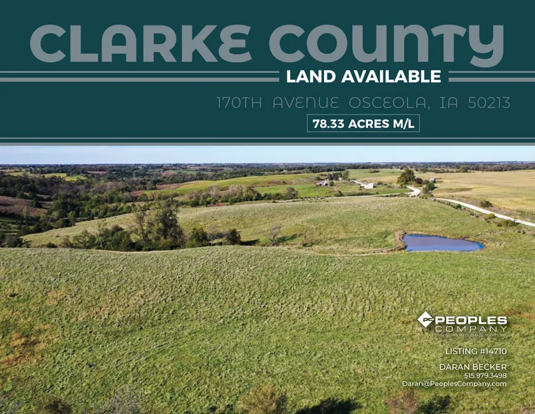 Peoples Company is proud to present 78.33 acres m/l of open pasture located 4.5 miles northwest of Osceola in Section 5 of Ward Township in Clarke County. The farm is split into two separate paddocks with cattle watering ponds in both tracts. The fences are in good shape and the pasture has been well taken care of. The north tract has approximately 28 acres that is considered tillable by the FSA and could be farmed. This would make an nice place to build or a great addition to any cattle operation.