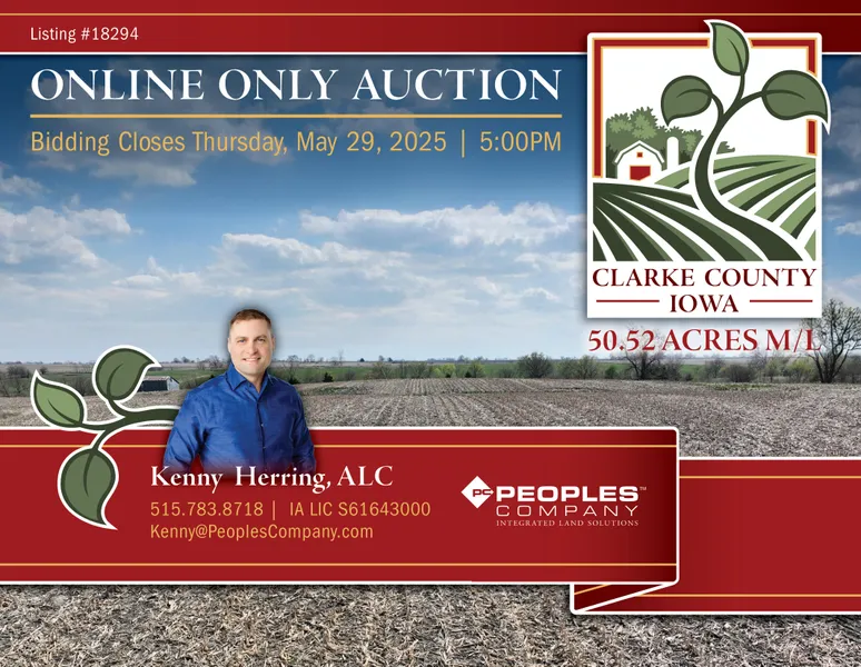 Peoples Company proudly represents The Estate of Stanley Comer in the sale of 50.52 acres m/l of prime farmland nestled between Osceola and Murray in Clarke County, Iowa. This high-quality tillable farmland is strategically positioned, offering great potential for farmers looking to expand their operations. The property will be offered via online-only auction through the Peoples Company Bid Wrangler auction platform. All bids are to be placed before Thursday, May 29th, 2025, at 5:00 P.M. CST.