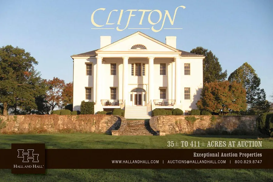 Since the Washington Familys stewardship in pre-Revolutionary War times, Clifton has always been a prestigious country estate with rolling hills and captivating views that give peace and serenity to those select few that have called it home. Located in the heart of Blue Ridge Hunt territory on the north end of the Shenandoah Valley, Cliftons historic homes and 411 acres will be sold at auction to only the 4th family of ownership in its history.