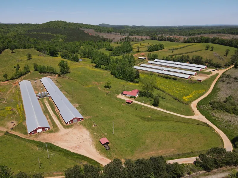 Boondocks Broiler Farm Six house Broiler and Cattle Farm in Clay County, ALBoondocks Poultry and Cattle Farm is secluded at the end of a County maintained road. The farm consists of 91+/- acres of mostly open, rolling pasture land in the foothills of Mt. Cheaha yet only a short distance from downtown Lineville. The poultry houses are 2- 43510 built in 2007 and 4-40400 built in 1997. The farm grows for Koch-Ashland Complex. The farm has a historical gross income of $275,000-$300,000 with a raise implemented in late 2022 the farm will gross $300,000+ at average pay. The farm is fully updated and on Kochs top pay.Poultry Farm Equipment and Features include:Rotem ControllersRoxell FeedersZiggity DrinkersH80 Brood LightsDigital BackupsAll tunnel fans are fiberglass and were installed in 2021Brooders two houses have been replaced recentlyFreezers for mortalityLP Gas5 WellsThe farm has a recently remodeled three bedroom two bathroom home. There is a covered carport as well as another storage shed. The fenced pasture has plenty of room for the diversity of income from livestock. There is a pond on the farm.A list of farm equipment can be provided with a price for each item to be sold separately.Poultry farms are biosecure facilities. Absolutely no visits to the farm withoutan appointment. All potential purchasers must be prequalified with the PoultrySouth Team prior to scheduling a farm visit.