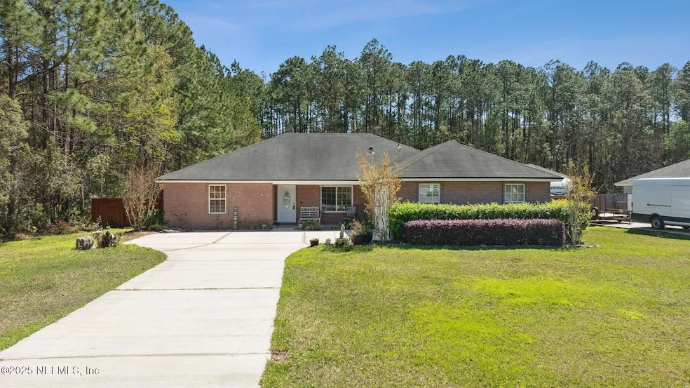 Welcome to this charming 4-bedroom, 2-bathroom home, perfectly situated on over an acre of peaceful land. With nearly 2,000 square feet of living space, this thoughtful floor plan offers privacy and comfort for all. With a split floor plan, the spacious owner's suite is tucked away on one side, providing a serene retreat, while the three additional bedrooms are on the opposite side of the home. The primary en-suite bath boasts an expansive vanity with dual sinks and a large walk-in closet. The wood-burning fireplace is the focal point of the living room, which is filled with an abundance of natural light. The household chef will find the kitchen is equipped with ample storage in its 42-inch cabinets and plenty of counter space for preparing meals. The attached 2-car garage provides space for vehicles and storage. The detached shed is ideal to house your lawn and gardening tools. Plenty of room to enjoy outdoor activities, gatherings, or simply relaxing in your private, rural setting. New roof to be installed prior to closing. Clay County schools.